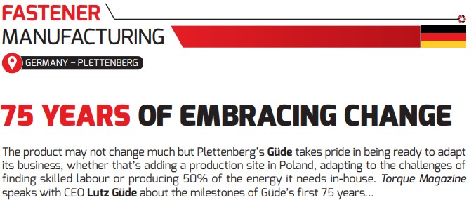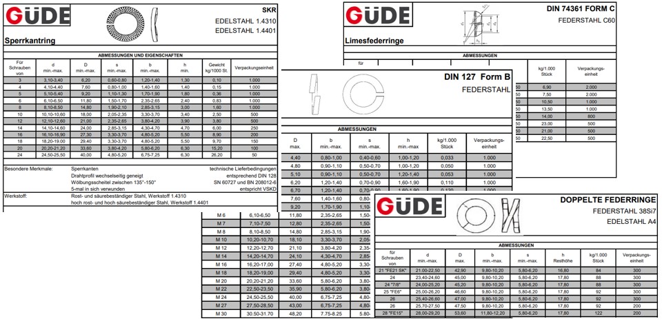 Die Güde GmbH wurde 1948 gegründet und fertigt auf ausschließlich selbst hergestellten Automaten Federringe, Drahtbiegeteile sowie Schrauben- und Wellensicherungen. Erfahrene Mitarbeiter, ein qualifizierter Werkzeugbau und eine eigene Härterei garantieren ein Maximum an Flexibilität und Qualität.